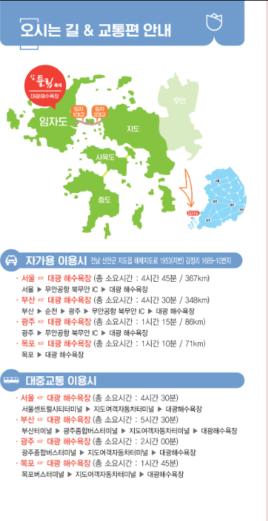 임자도는 서울에서 차로 약 3시간 정도 소요되는 거리에 위치하고 있습니다. 축제 기간 중에는 방문객이 많아 교통 혼잡이 예상되므로, 대중교통 이용을 추천합니다. 특히, 인천에서 출발하는 페리 서비스를 활용하면 좀 더 편리하게 임자도로 이동할 수 있습니다.